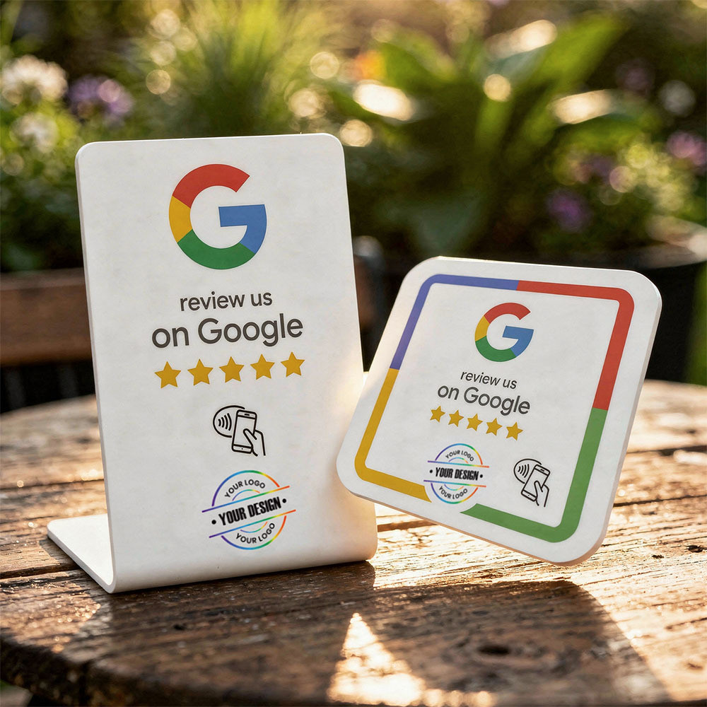Ease of Use: Both are simple and easy to use. Users simply need to touch the card or table stand with their smartphone to access and review your business on Google. They are effective tools for improving online presence, increasing customer trust, and boosting sales for businesses. Enhanced Online Presence: By collecting more reviews, these tools strengthen your business's presence online, which is critical for attracting potential customers. Increased Customer Trust: Positive reviews build trust between your business and customers, leading to repeat purchases. Efficiency: Customers who interact with the card or touch the table stand are more likely to leave a review, increasing the number of reviews for your business. Customization: You can customize both the card and table stand by adding your logo, contact information, and other relevant details. Variety of Options: Colorful printing allows you to choose what best suits the aesthetics and branding of your business.